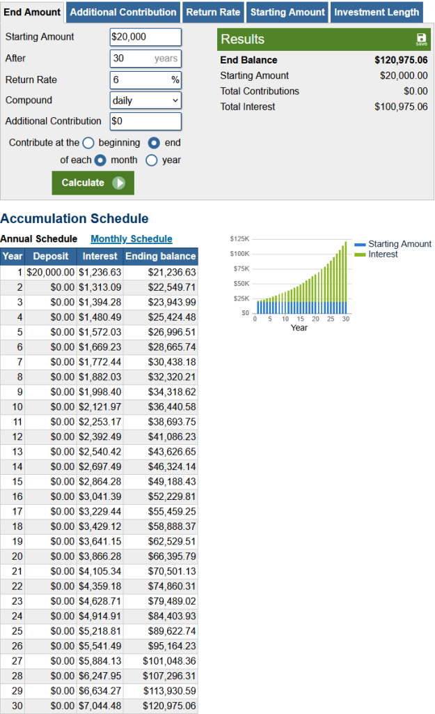 This example shows a starting initial investment of $20,000 earning the average return of the S&P 500 of 6%, every year for 30 years, with no additional contributions, and compounded daily. The ending result, simply for having started 30 years early and investing nothing else, is an ending balance of over $120,000.